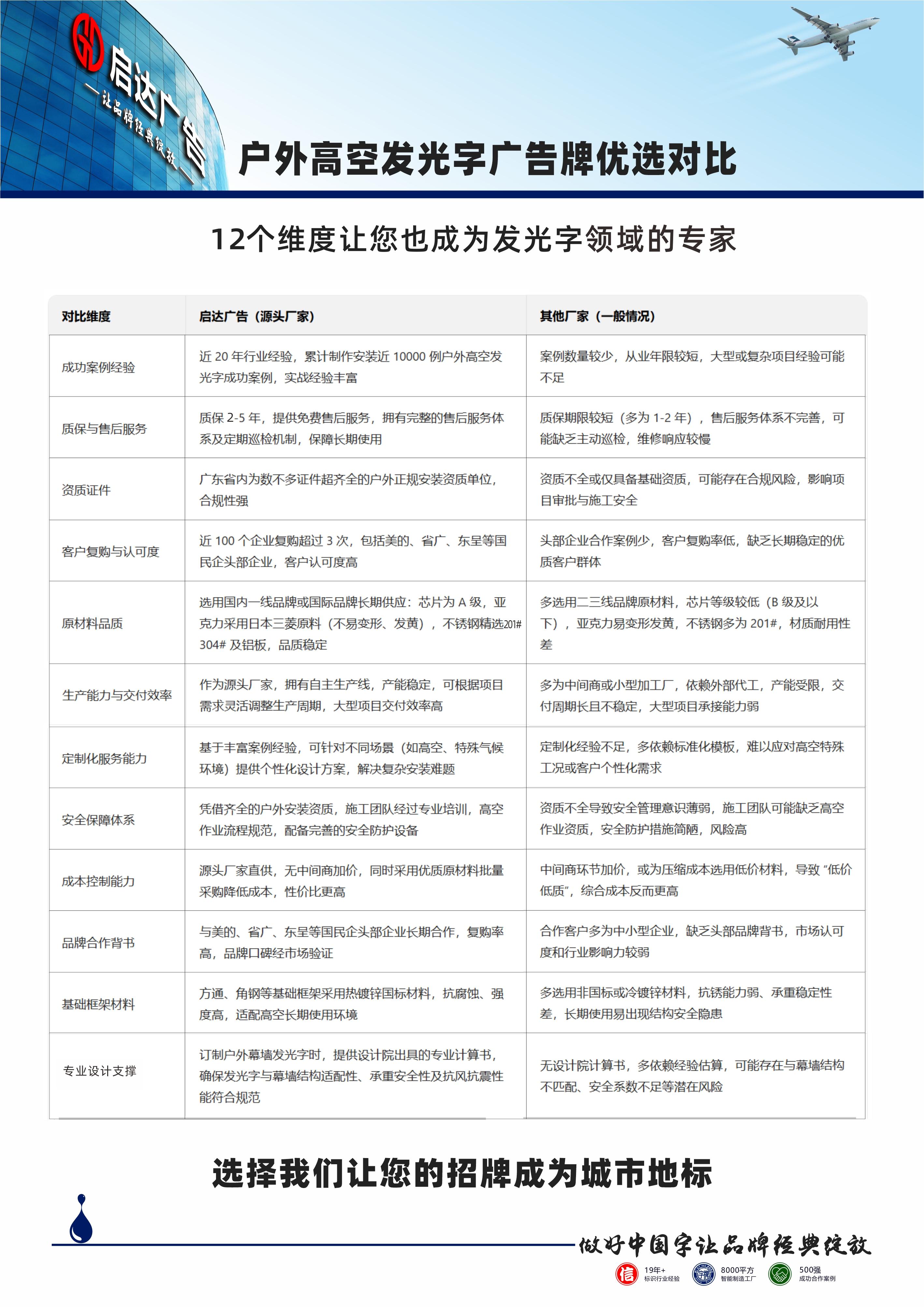 啟達廣告自 2005 年專注于發光字設計制作加工安裝維護領域至今快20多個年頭,2019 年在廣東省江門臺山建成近萬平方的中央工廠,在廣州天河區黃埔大道 CFC 設立深化設計與業務中心。