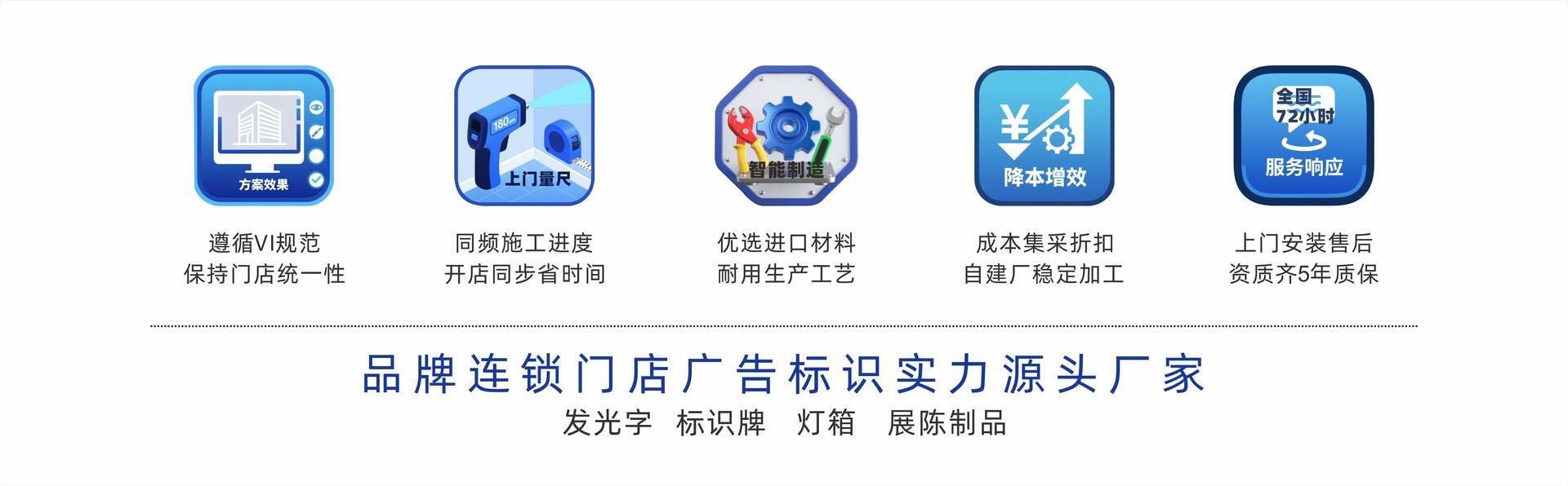 20余年專注幕墻發光字、連鎖門店標識、精工字、停車場標識等應用場景的標識牌、發光字、燈箱等廣告制品設計制作安裝施工維護于一體的綜合性廣告標識服務商。