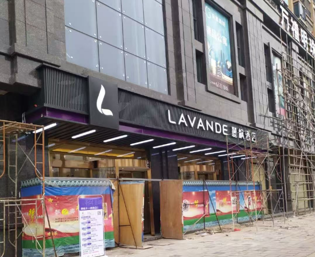 標識比例的場景化校準:針對酒店臨街門頭的行人視角與樓頂廣告牌的遠距離視覺需求,啟達設計師通過多次現場測繪,將 “LAVANDE” 英文標識與 “麗楓酒店” 中文名稱的比例調整至 1:1.2,確保 50 米內行車視角與 3 米內行人視角均能清晰識別,同時保持字體線條的柔和弧度與品牌 “舒適、浪漫” 的調性一致。